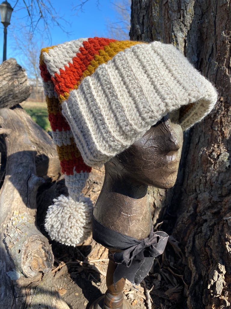 This handmade slouchy beanie features a creamy oat ribbed brim with warm harvest stripes in pumpkin orange, mossy gold, and soft ivory, finished with a fluffy oversized pom. The long, drooping shape gives it a whimsical, slightly enchanted look — like something you’d find in a cottage witch’s wardrobe.