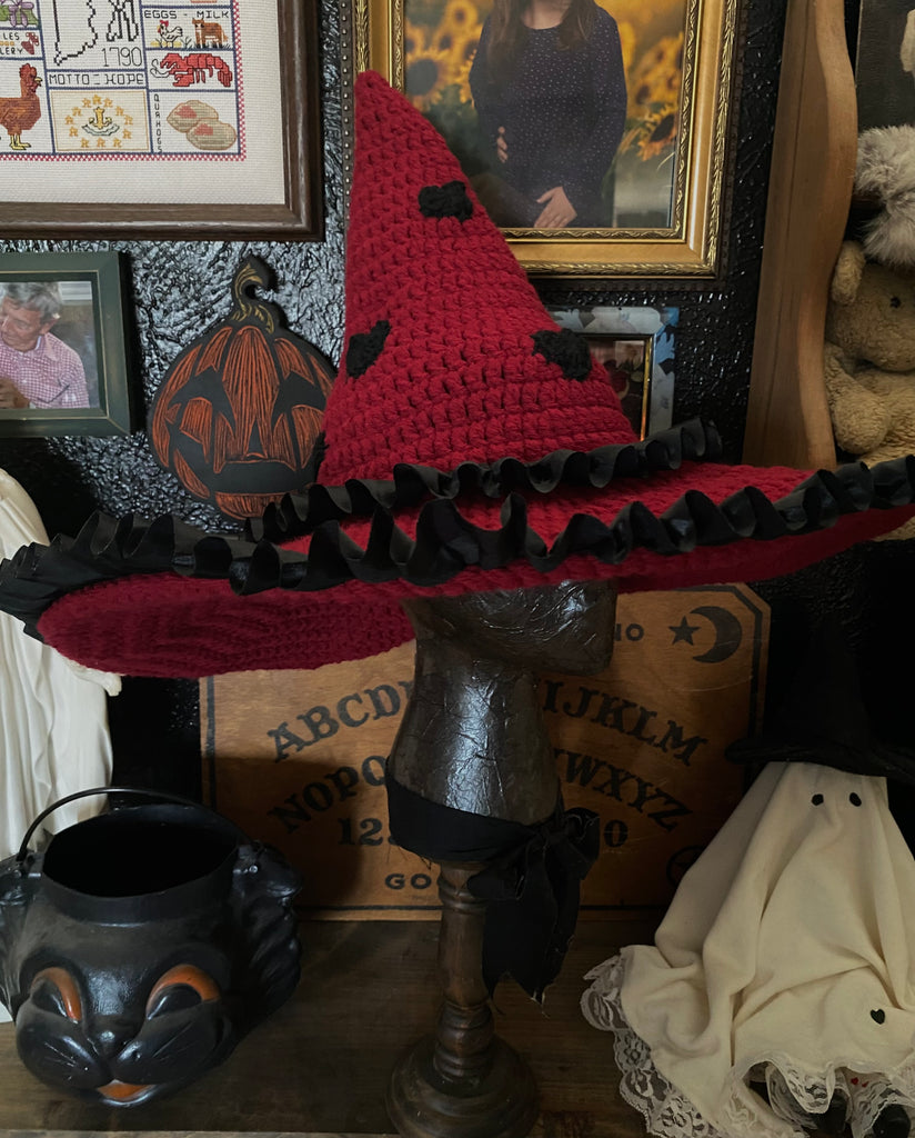 Our Valentine Witch Hat is a handmade statement piece featuring a deep crimson crochet body, sweet black heart details, and a dramatic ruffled black brim for extra spellcasting flair.